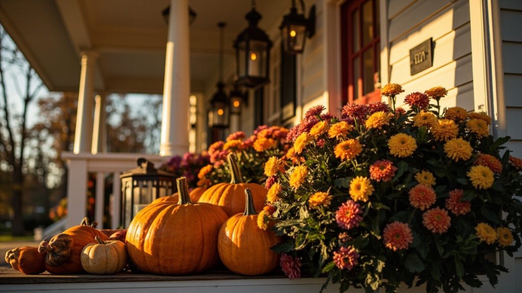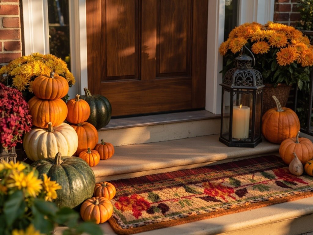 - Large Entryways: Go bold with layered rugs, clusters of pumpkins, tall planters filled with mums, and multiple lanterns. Add a console table for seasonal styling opportunities.