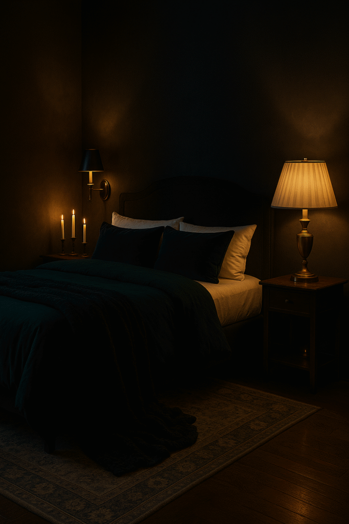 Lighting is the unsung hero of moody bedroom design. The goal? Warm, layered lighting that glows—not glares.