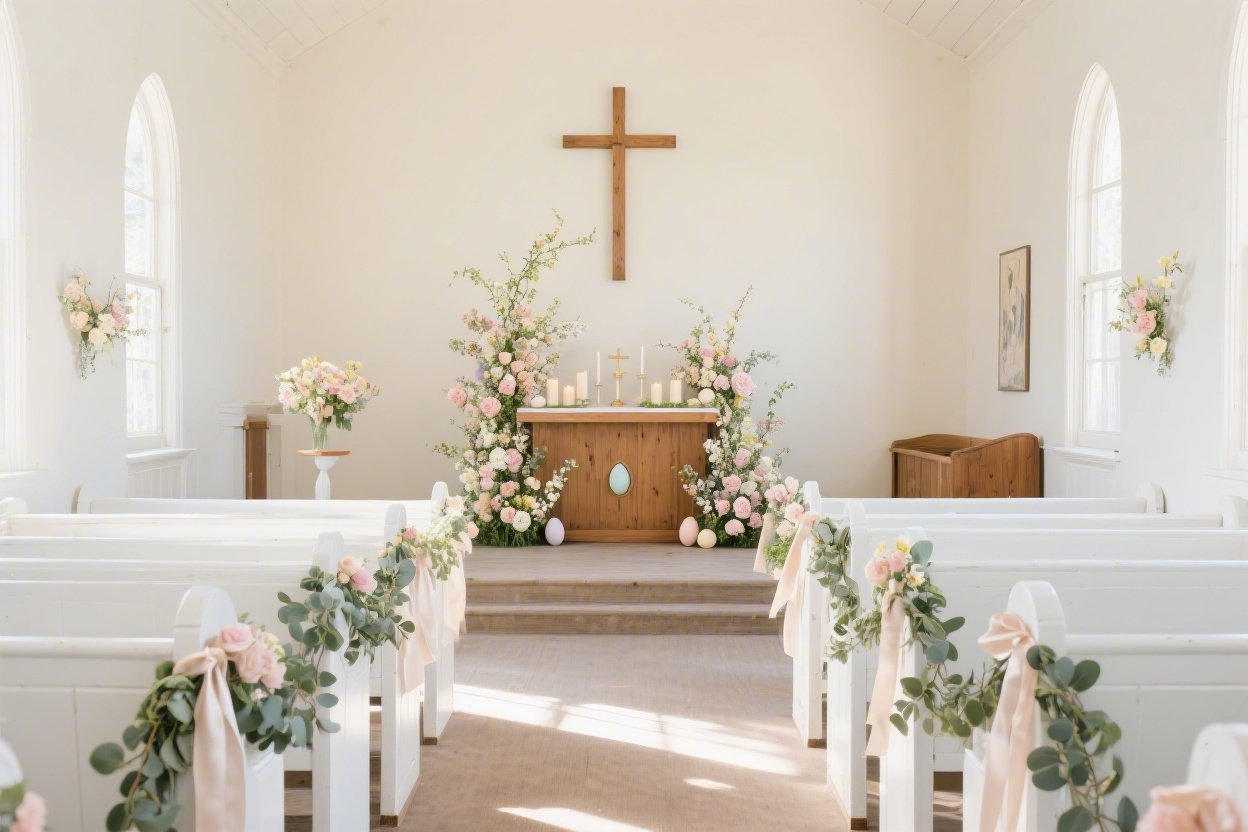 • Accents: A watercolor-style “He Is Risen” sign on a wooden easel; soft gauze ribbons on pew ends.
