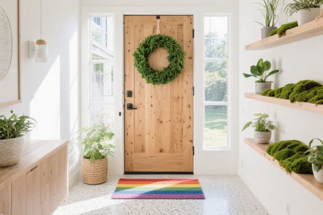 Let’s start at the door. Picture a clean, white front door crowned with a lush emerald wreath—not Christmasy, just rich and botanical. On the ground, a rainbow welcome mat arcs across slate-gray pavers, instantly setting a cheerful tone.