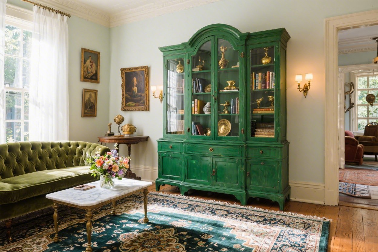 Let’s get playful. Picture clay-terracotta walls and a vintage parlor cabinet hand-painted in a muted teal with sanded edges. Every nick feels like a story.