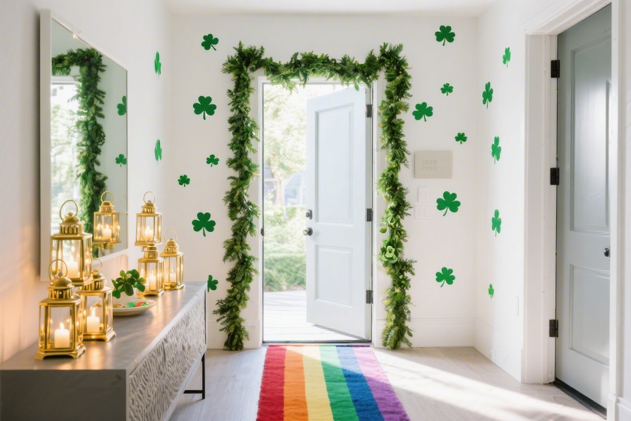 Wide, straight-on foyer shot: a chic emerald entryway with a tall, thick green garland arch framing the doorway, eucalyptus tucked in for texture; slim black console beneath a round brass mirror; scattered shamrock wall decals like confetti around the mirror; a gold lantern cluster of three heights with clear glass panes and soft pillar candles glowing; narrow rainbow runner rug stretching down the hall, colors picking up green and gold; small bench or stool, umbrella stand, woven basket for keys; deep green, black, brass, and multicolor accents; evening ambient light with warm candle glow; photorealistic.