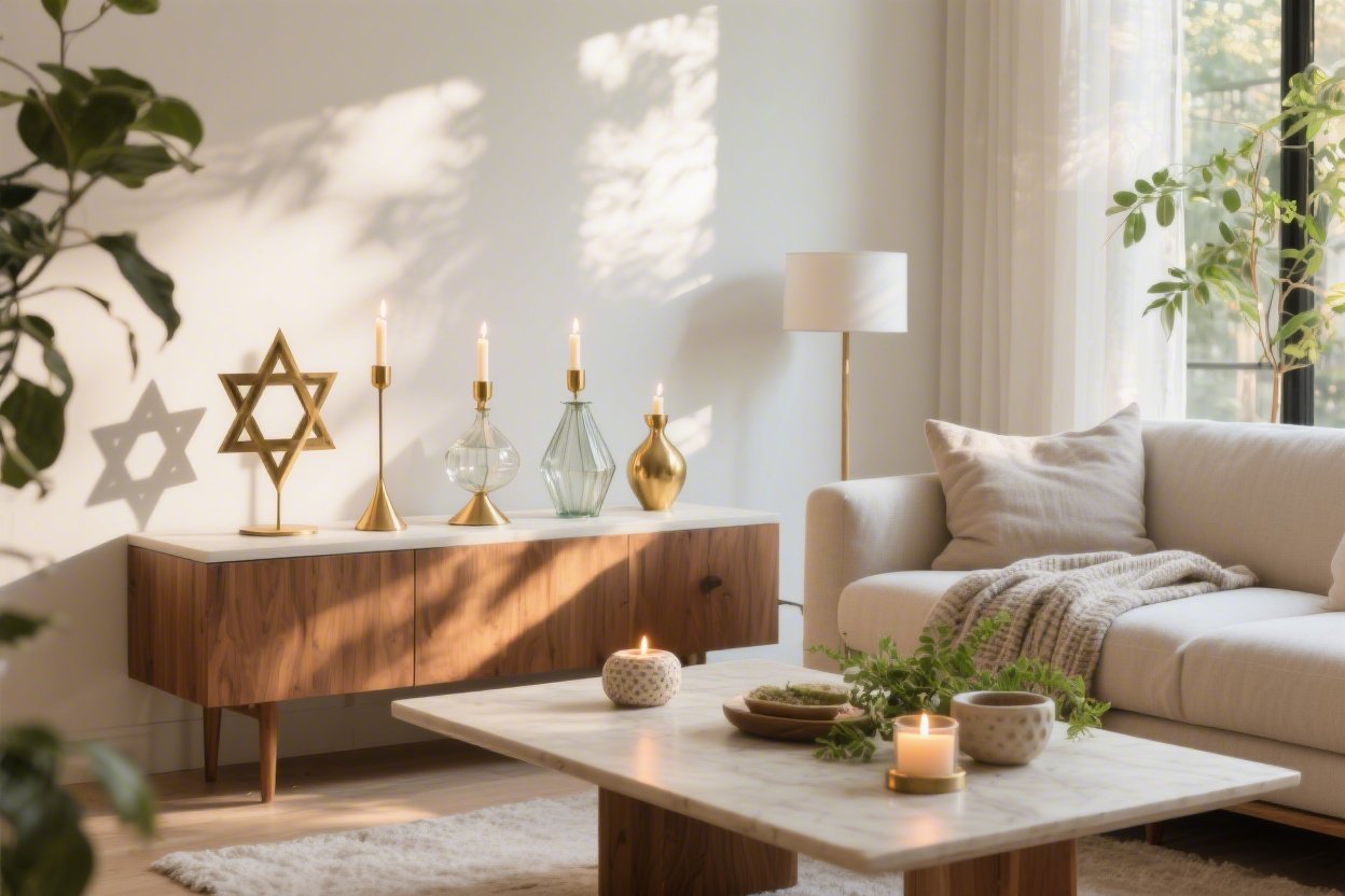 Your Star of David candle holder is a slender, brass geometric piece sitting on a travertine tray at the center of the coffee table. To echo the geometry, hang a simple black-framed line drawing above the sofa and add two sculptural ceramics in off-white on the media console.