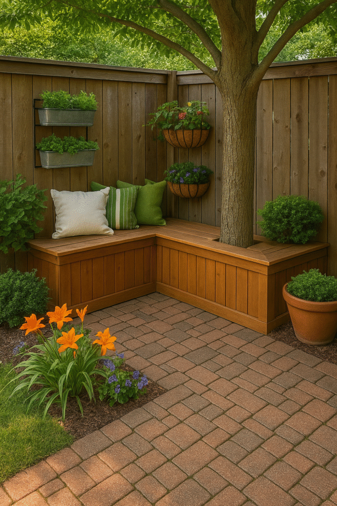 Maximize space with built-in benches that double as storage. A wooden bench around a corner or tree can offer seating and space for cushions, tools, or blankets.
