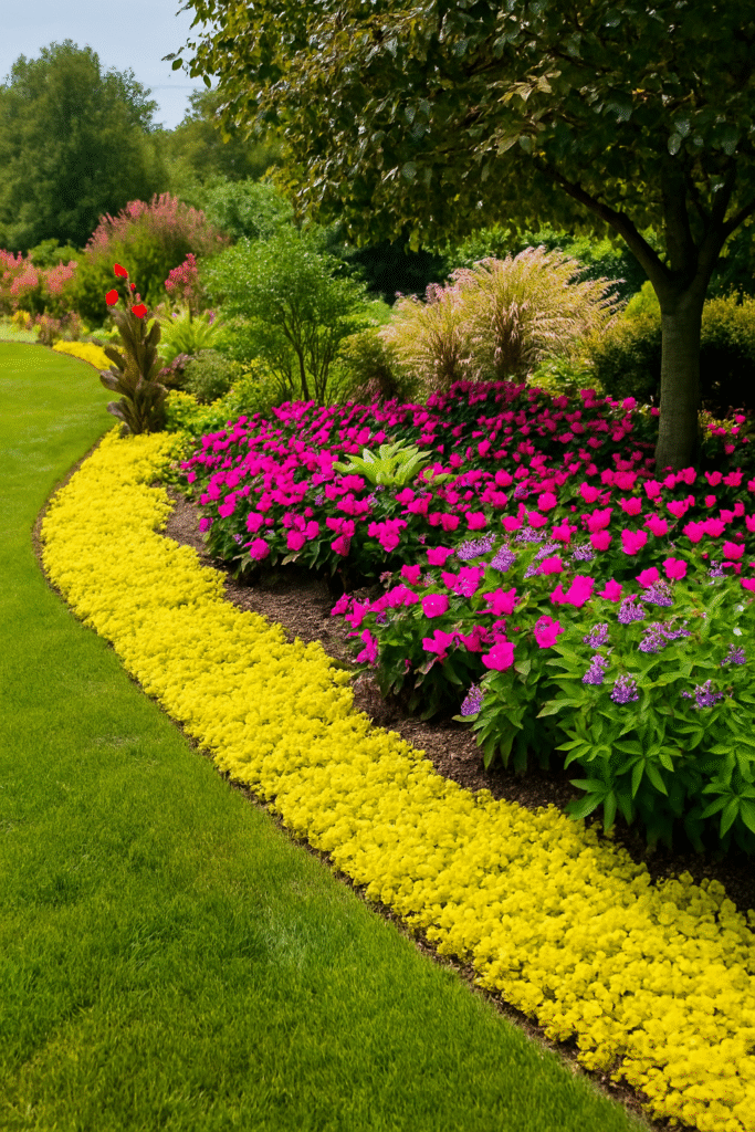 Border your yard with bold color by planting low-growing flowers like Impatiens, Begonias, or Dwarf Zinnias around trees or fencing. Add in a layer of Creeping Jenny or Sedum for lush contrast.
