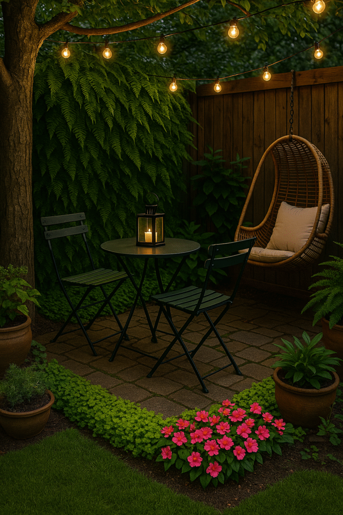 In small spaces, less is more. A tiny bistro table and two chairs tucked into a corner can create a café-style retreat. Or hang a swing chair from a pergola or tree branch for an instant cozy vibe.