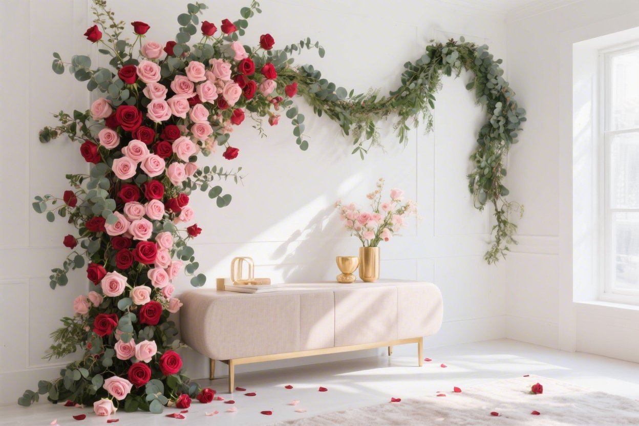 Make your entrance unforgettable. Line your stair rail with a waterfall of eucalyptus, then tuck in clusters of ivory and berry-toned roses like jewelry down the banister. At the landing, mount a compact floral Valentine’s Day backdrop as a photo spot.