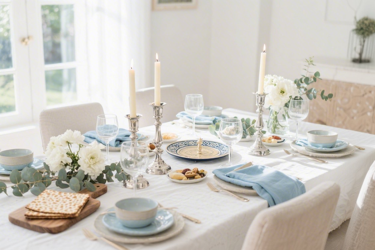 Choose matte porcelain plates, smooth white flatware, and frosted glass stemware. The Seder plate becomes a statement sculpture—think matte white ceramic with recessed wells and minimalist labels.