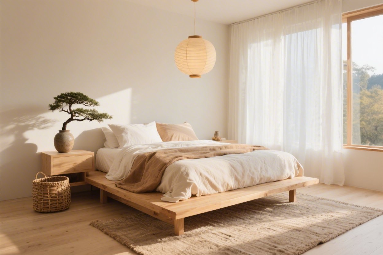 - Accents: Woven tatami-look mat, bamboo tray, small bonsai or ikebana stem
