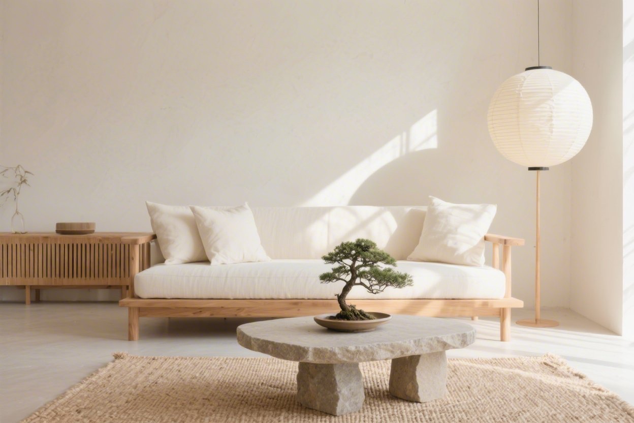 Grounded and textural. Lay down a tatami-style rug or layered seagrass mats to set the tone. Seating is low and simple: a platform sofa with cotton cushions or a couple of zaisu-style floor chairs with back support.