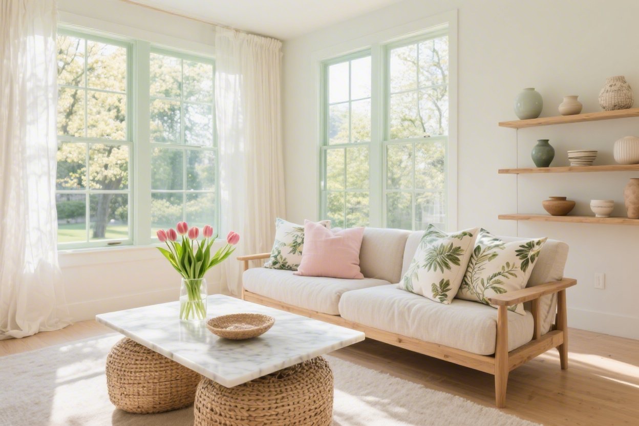 Layer in pastel accents: dusty rose pillows, periwinkle candlesticks, and a mint-striped throw. Add a gilded mirror, a vintage-inspired fluted floor lamp, and a slim gallery wall of sketches for that café-in-April feeling.
