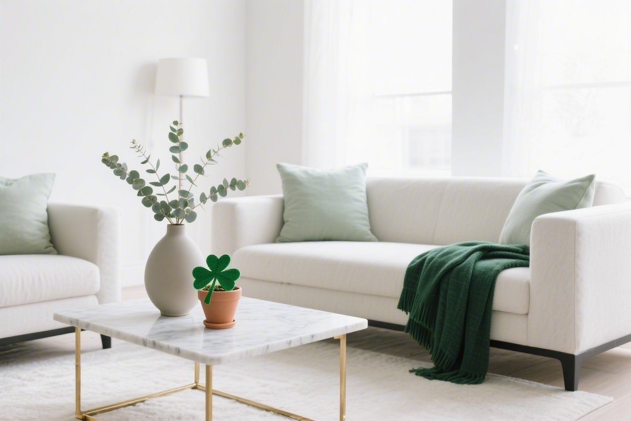 Your St. Patrick’s nod is subtle: a single emerald velvet lumbar pillow, a stoneware bowl of moss on the coffee table, and a framed abstract print with soft sage brushstrokes. Keep surfaces spare. One travertine slab coffee table, one unglazed ceramic vase with eucalyptus, and a linen throw folded with intention.